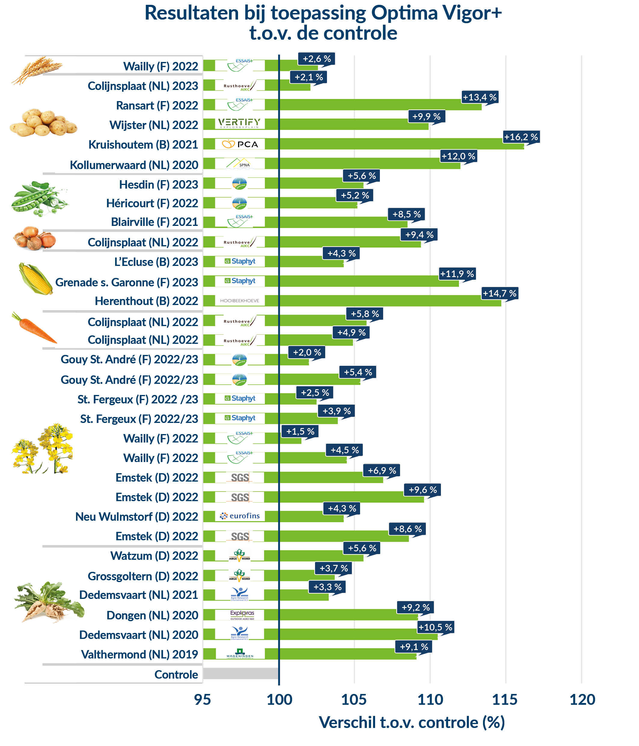 Soiltech besteedt veel aandacht aan bewijs in de praktijk. Hierboven een overzicht van een aantal belangrijke testresultaten. Daaruit blijkt dat Optima Vigor+ telkens weer een meerwaarde oplevert ten opzichte van de praktijkreferentie, in meerdere gewassen.