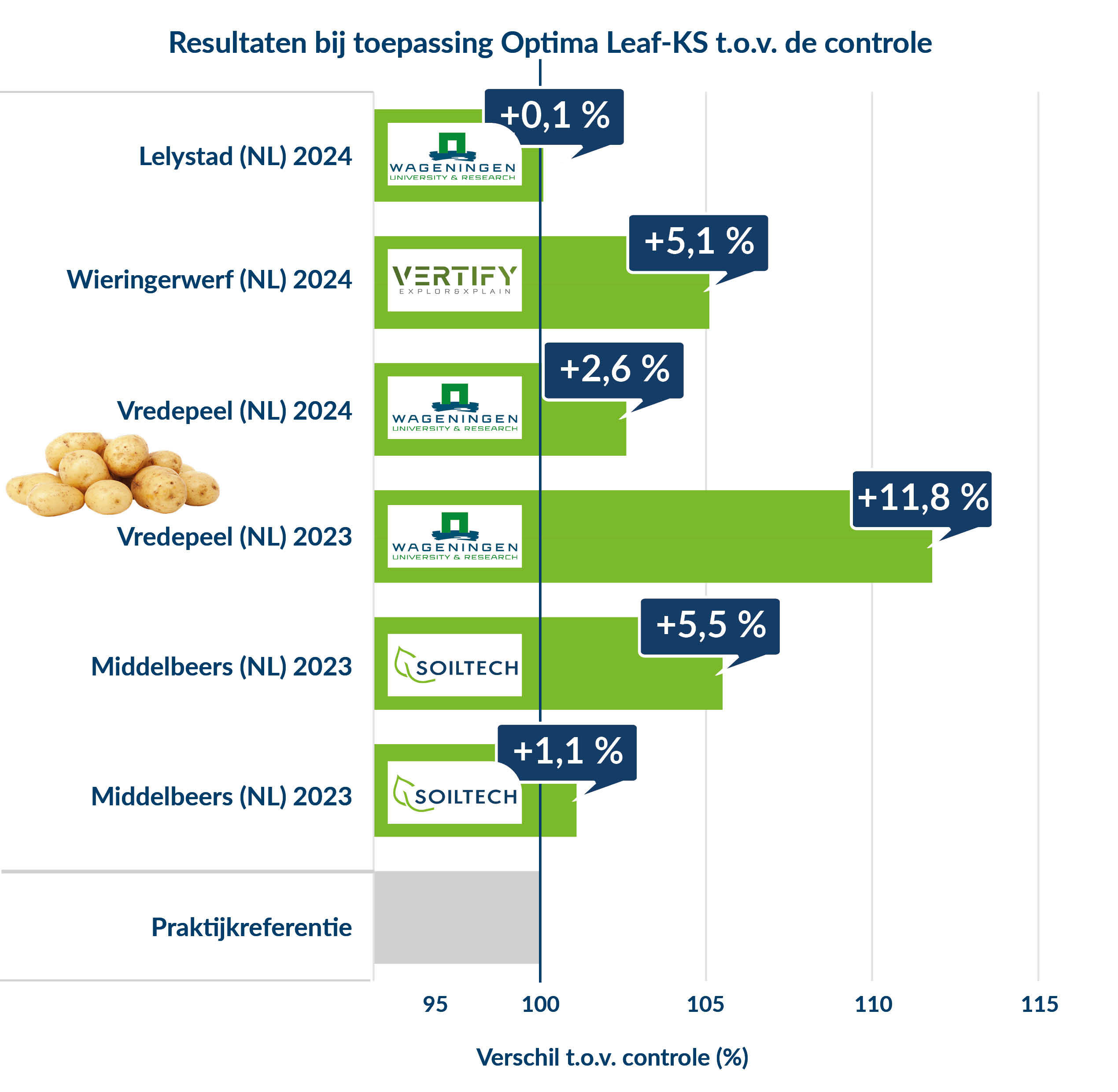 Soiltech besteedt veel aandacht aan bewijs in de praktijk. Hieronder een overzicht van een aantal belangrijke testresultaten. Daaruit blijkt dat Optima Leaf-KS telkens weer een meerwaarde oplevert ten opzichte van de praktijkreferentie.